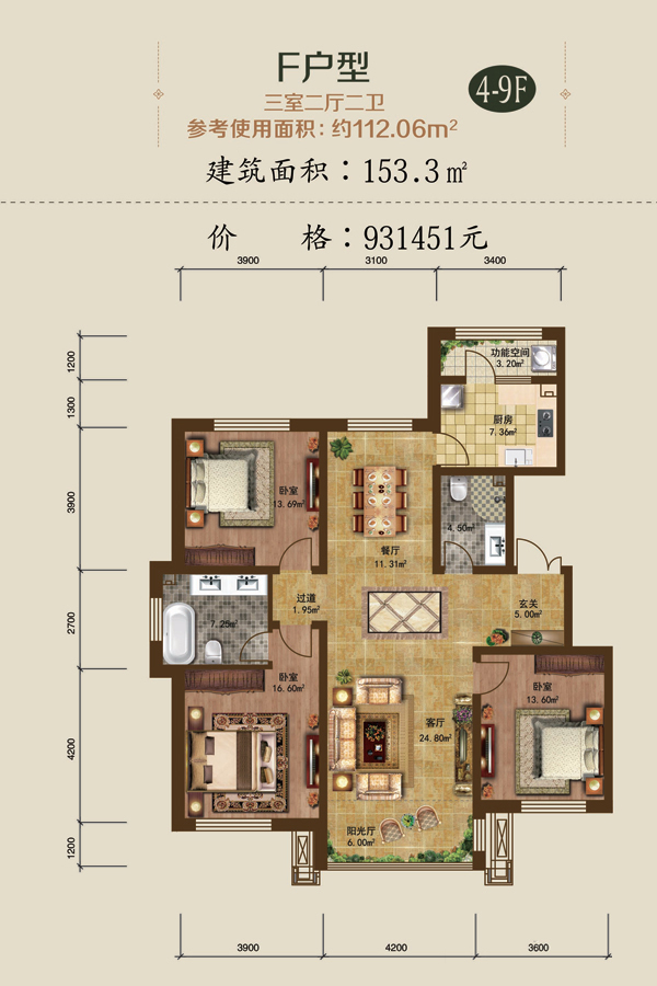 建面:153.3 ㎡ 93.15 元/㎡