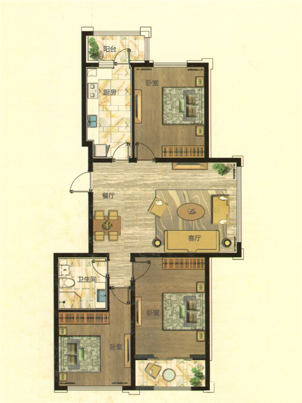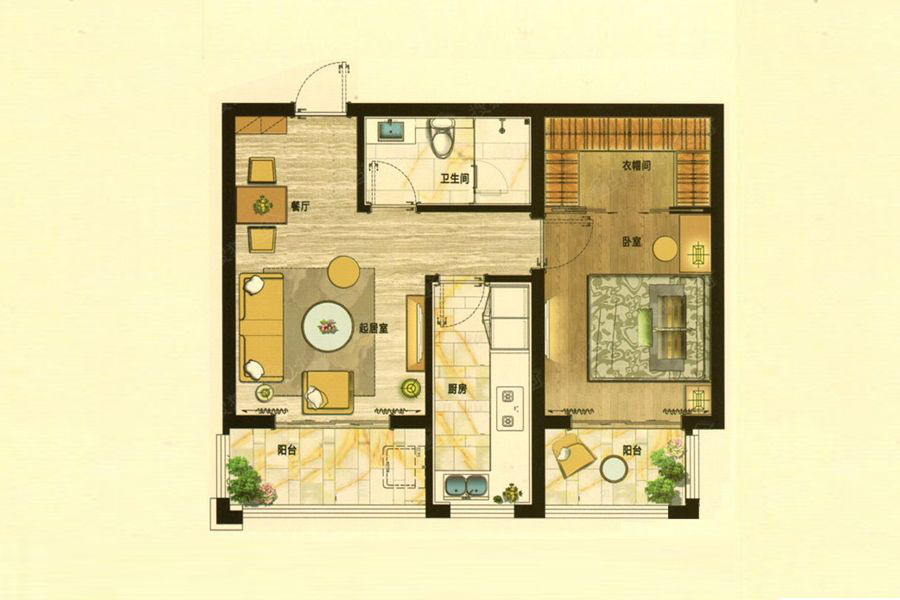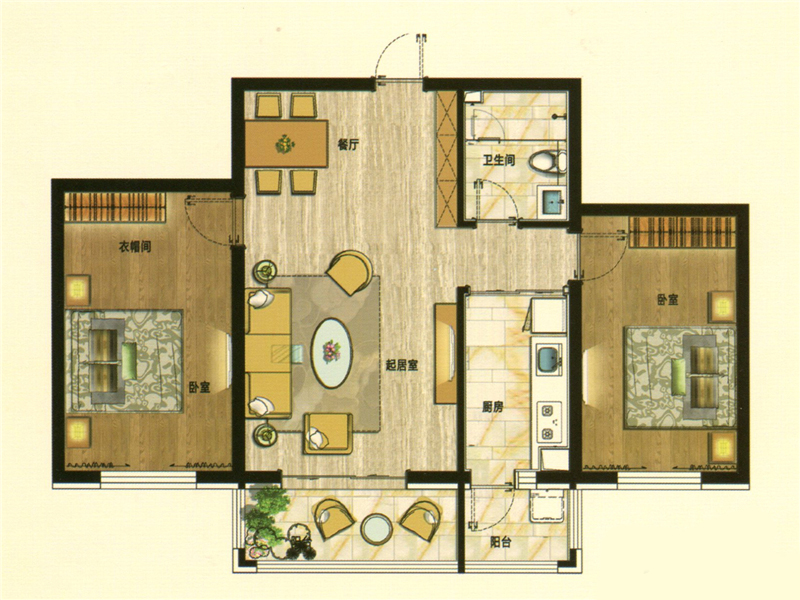 各个空间户型方正,方便室内家具布置;南北不通透的户型,后期居住时常开门通风换气即可;卫生间如没有窗子,可加管道通风,但是相对来说卫生间有窗户是好的情况,利于排湿,不会使湿气进到室内。厨房门朝向客厅,装修时要侧重考虑除油烟的措施;客厅、卧室、卫生间和厨房等主要功能间的尺寸以及比例适中,有利于采光和通风