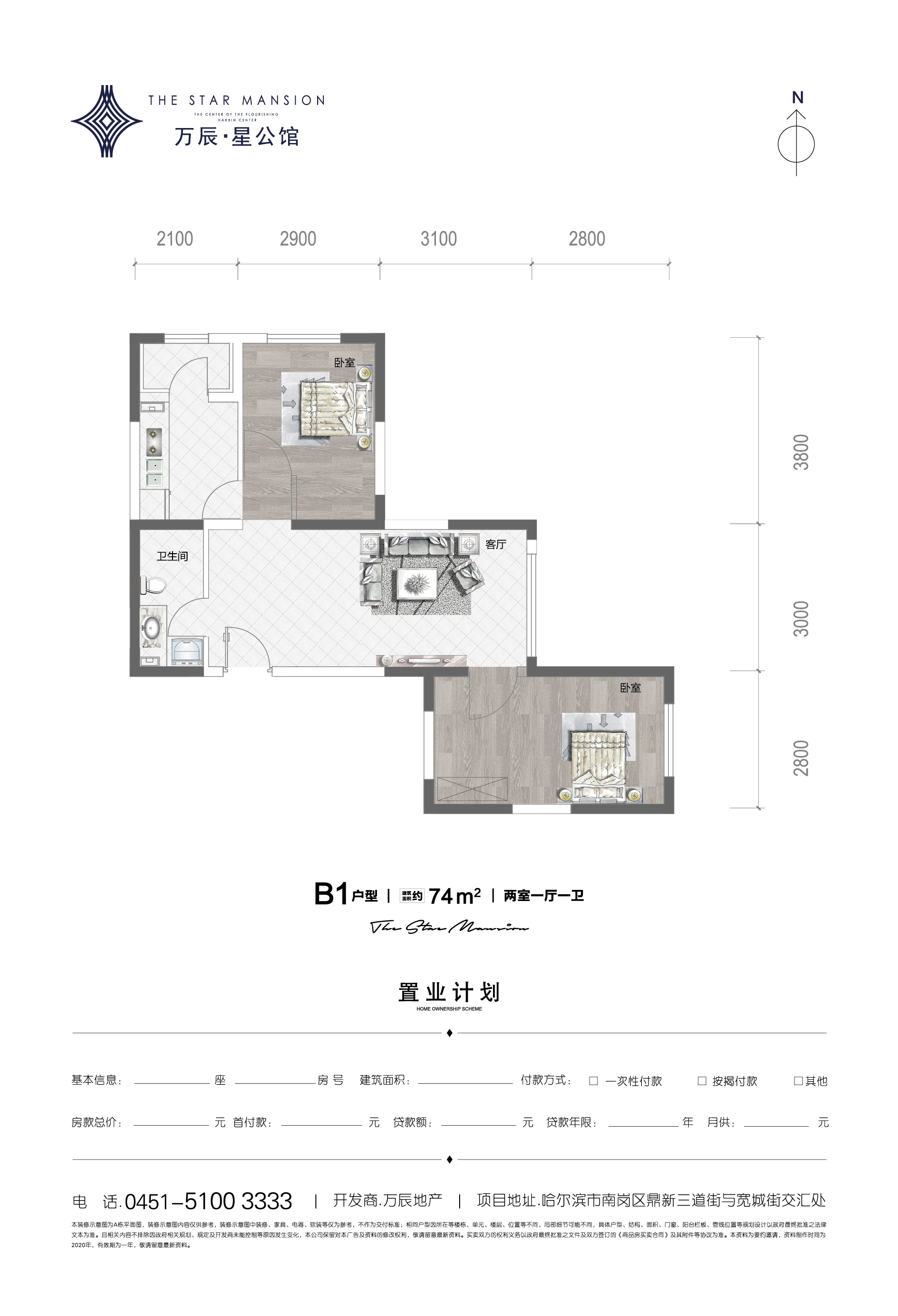 万辰星公馆2室1厅1厨1卫 总价待定