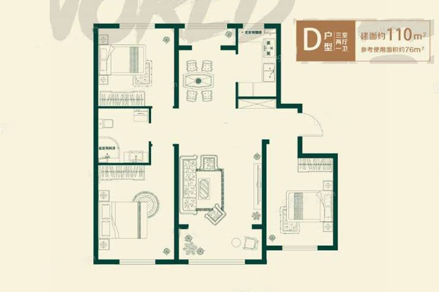 各个空间户型方正,方便室内家具布置;卫生间如没有窗子,可加管道通风,但是相对来说卫生间有窗户是好的情况,利于排湿,不会使湿气进到室内。厨房门朝向客厅,能加装门即可规避油烟对客厅的影响;各个功能区的尺寸比例规范,布局合理,能很好地满足日常功能需求,整体空间开阔,采光充足,居住舒适度好;公摊高于15%且